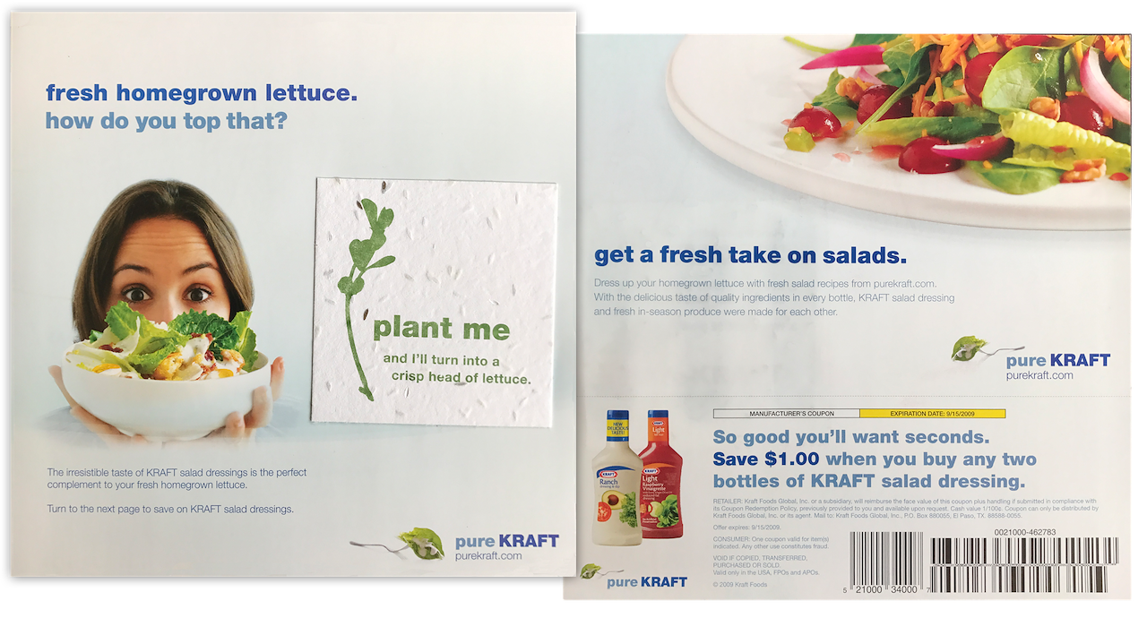 We also took advantage of the 5 million subscribers of Kraft’s own Food & Family magazine. We placed an insert with real lettuce seeds, so you could grow the freshest lettuce to go with the freshest ranch salad dressing.